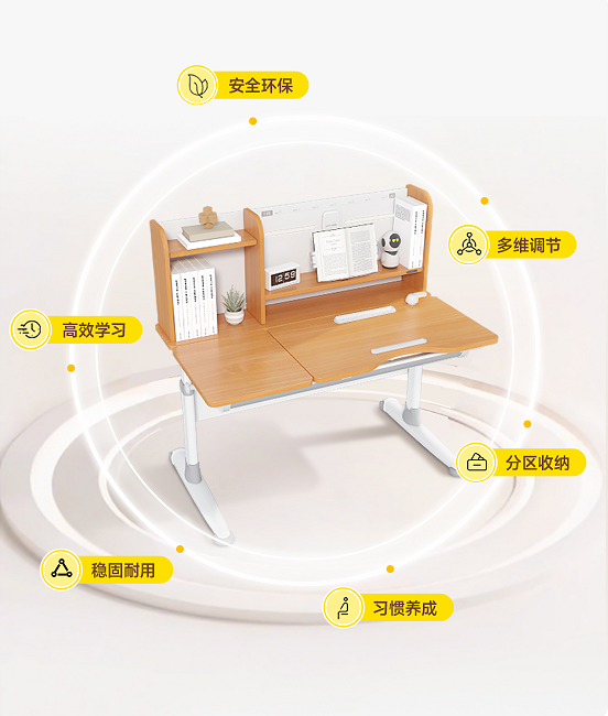 光明园迪将家长对孩子的“健康、安全、专注”诉求,转化为学习桌的功能细节,构建五大守护体系: