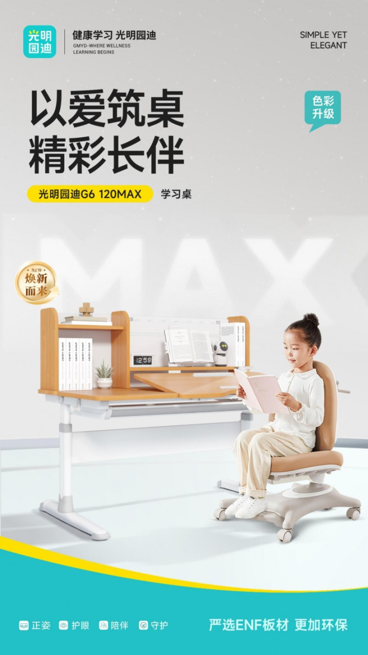 每一种色彩,都是孩子个性的延伸;每一处设计,都藏着光明园迪对“成长守护”的理解。G6Max学习桌不仅是一件学习装备,更是陪伴孩子从童年迈向少年的“成长伙伴”——以爱筑桌,让每一笔书写、每一次探索,都成为“健康与未来”的注脚,守护成长每一刻。