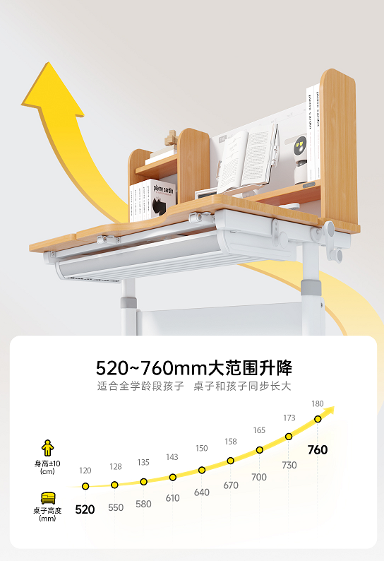 身高适配:520-760mm大范围升降调节,搭配清晰身高刻度线,从孩子启蒙阶段到成年,手动摇把即可轻松调整,让桌子始终“贴合”孩子身高,避免弯腰驼背,守护挺拔体态。