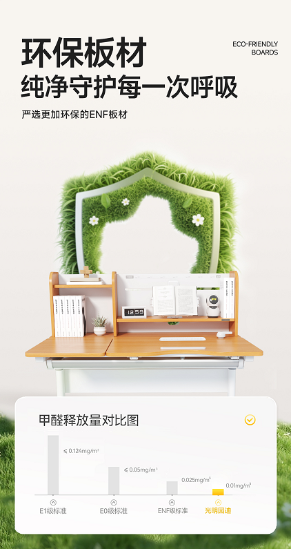 孩子的健康是家庭关注的核心,G6Max学习桌从“呼吸守护”出发,严选ENF级环保板材,甲醛释放量远优于行业标准。让孩子在“会呼吸”的纯净空间里学习,家长无需担忧甲醛隐患,为成长筑牢健康根基。